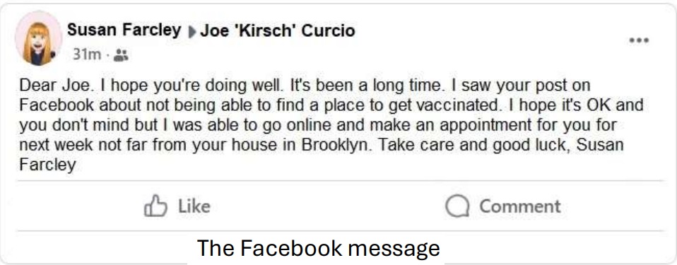 "Dear Joe. I hope you're doing well. It's been a long time. I saw your post on Facebook about not being able to find a place to get vaccinated. I hope it's OK and you don't mind but I was able to go online and make an appointment for you for next week not far from your house in Brooklyn. Take care and good luck, Susan Farcley".